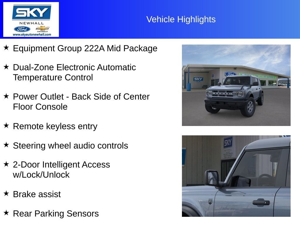 Big Bend 2-Door Intelligent Access w/Lock/Unlock, Ambient Footwell Lighting, Black Alloy Wheels, Brake assist, Connected Navigation, Dr & Pass Illuminated Sliding Visor Vanity Mirrors, Dual Smart Charging USB Ports, Dual-Zone Electronic Automatic Temperature Control, Equipment Group 222A Mid Package, Exterior Parking Camera Rear, Front Row Heated Seats, Heated door mirrors, Leather Shift Knob, Power Outlet - Back Side of Center Floor Console, Rear Parking Sensors, Rear-Window Defroster & Washer, Remote keyless entry, Split folding rear seat, Steering wheel audio controls. Price includes: $1000 - Auto Show Retail Bonus Cash. Exp. 03/02/2026