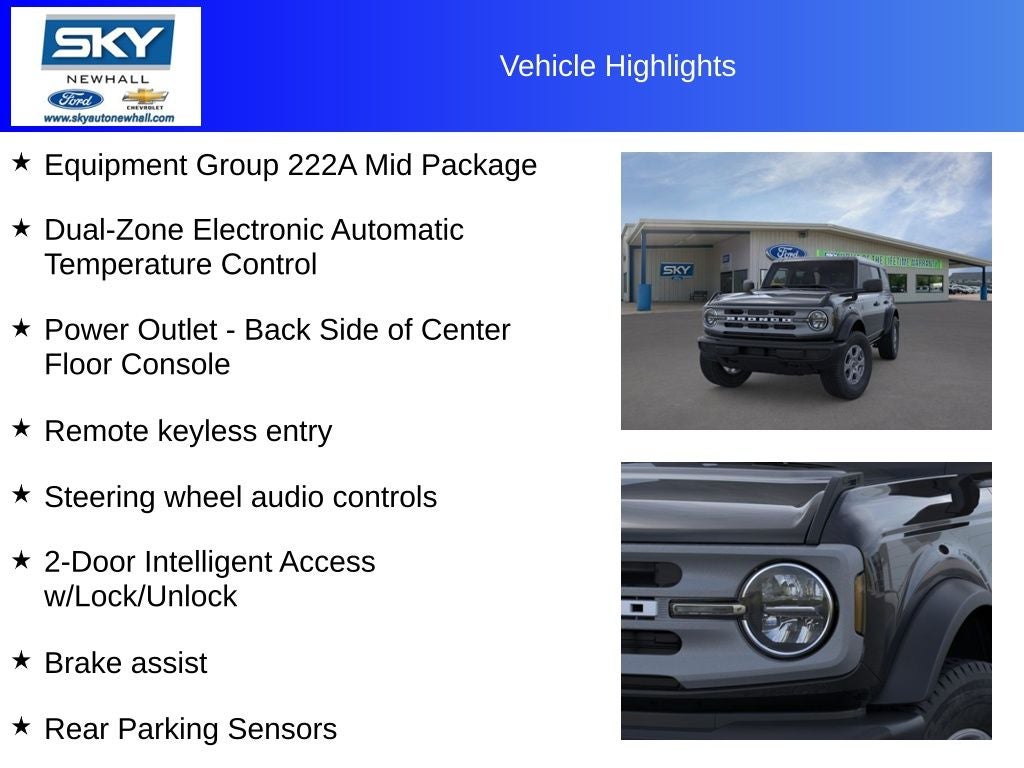 Big Bend 2-Door Intelligent Access w/Lock/Unlock, Ambient Footwell Lighting, Black Alloy Wheels, Brake assist, Connected Navigation, Dr & Pass Illuminated Sliding Visor Vanity Mirrors, Dual Smart Charging USB Ports, Dual-Zone Electronic Automatic Temperature Control, Equipment Group 222A Mid Package, Exterior Parking Camera Rear, Front Row Heated Seats, Heated door mirrors, Leather Shift Knob, Power Outlet - Back Side of Center Floor Console, Rear Parking Sensors, Remote keyless entry, Split folding rear seat, Steering wheel audio controls. Price includes: $2500 - Retail Customer Cash. Exp. 03/31/2026 Discount available on eligible purchases when you finance through a participating preferred lender and trade in a 2016 or newer vehicle with fewer than 75,000 miles. Customers using outside financing or manufacturer special APR programs (including 0%) are not eligible. All financing subject to credit approval and program availability. Offer valid through Exp. 02/27/2026. See dealer for details Discount available on eligible purchases when you finance through a participating preferred lender and trade in a 2016 or newer vehicle with fewer than 75,000 miles. Customers using outside financing or manufacturer special APR programs (including 0%) are not eligible. All financing subject to credit approval and program availability. Offer valid through Exp. 02/28/2026. See dealer for details Discount available on eligible purchases when you finance through a participating preferred lender and trade in a 2016 or newer vehicle with fewer than 75,000 miles. Customers using outside financing or manufacturer special APR programs (including 0%) are not eligible. All financing subject to credit approval and program availability. Offer valid through Exp. 01/31/2031. See dealer for details
