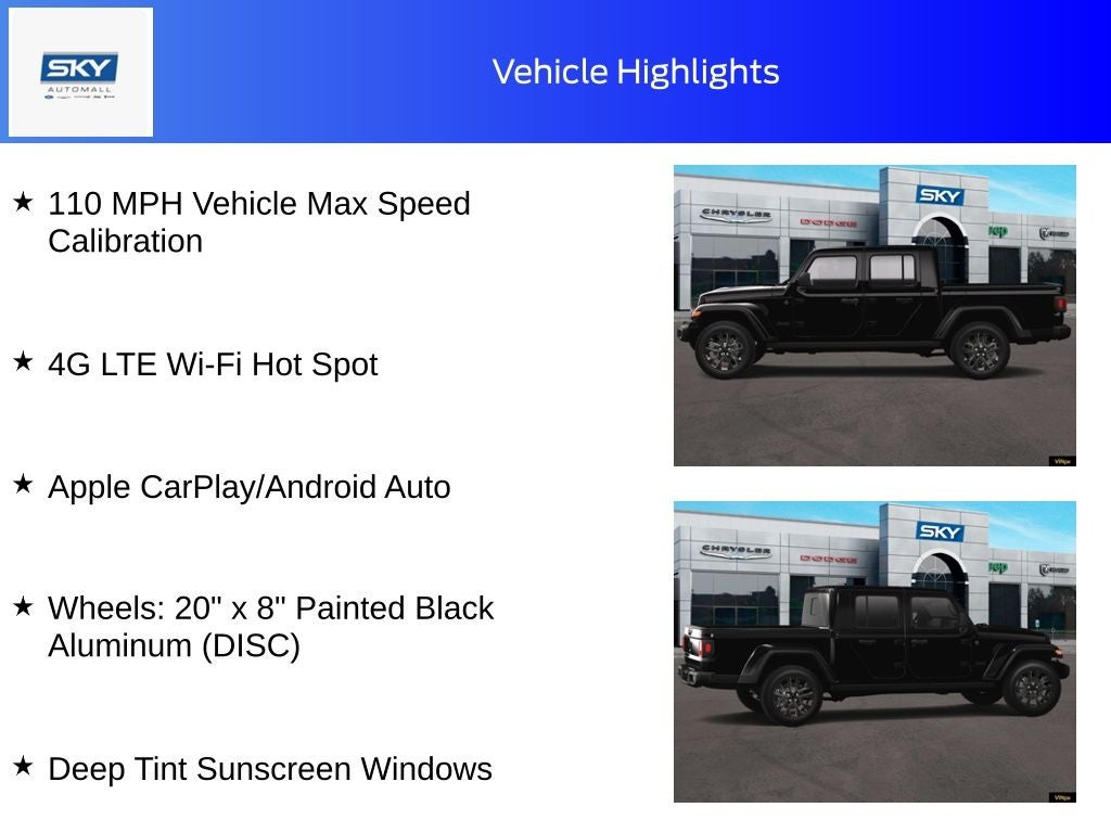 Black Clearcoat 2025 Jeep Gladiator Nighthawk 4WD 8-Speed Automatic 3.6L V6 24V VVT 110 MPH Vehicle Max Speed Calibration, 4G LTE Wi-Fi Hot Spot, Anti-Spin Differential Rear Axle, Apple CarPlay/Android Auto, Body Color Fender Flares (2-Piece), Brake assist, Dana M210 Wide Front Axle, Dana M220 Wide Rear Axle, Daytime Running Lamp System, Deep Tint Sunscreen Windows, Mold In Color Bumper w/Gloss Black, ParkView Rear Back-Up Camera, Power Heated Mirrors, Protection Sill Rails, Quick Order Package 24X Night Hawk (DISC), Rear Window Defroster, Remote keyless entry, Sport Rear Shock Absorbers, Sport Suspension (DISC), Steering wheel mounted audio controls, Wheels: 20 x 8 Painted Black Aluminum (DISC). Price includes: $1250 - 2025 National Retail Bonus Cash . Exp. 02/02/2026 $1500 - 2025 National Stellantis Loyalty Retail Bonus Cash . Exp. 02/02/2026 Discount available on eligible purchases when you finance through a participating preferred lender and trade in a 2016 or newer vehicle with fewer than 75,000 miles. Customers using outside financing or manufacturer special APR programs (including 0%) are not eligible. All financing subject to credit approval and program availability. Offer valid through Exp. 01/31/2030. See dealer for details Discount available on eligible purchases when you finance through a participating preferred lender AND trade in a 2016 or newer vehicle with fewer than 75,000 miles. Customers using outside financing or manufacturer special APR programs (including 0%) are not eligible. All financing subject to credit approval and program availability. Offer valid through Exp. 01/30/2031. See dealer for details