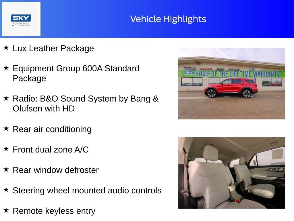 Red Metallic 2026 Ford Explorer Platinum 4WD 10-Speed Automatic 2.3L EcoBoost I-4 4WD, ActiveX Trimmed Captain's Chairs, Alloy wheels, Apple CarPlay/Android Auto, Brake assist, Equipment Group 600A Standard Package, Exterior Parking Camera Rear, Front dual zone A/C, Heated door mirrors, Heated front seats, Heated rear seats, Heated steering wheel, Leather steering wheel, Lux Leather Package, Platinum Badges on Front Row Seats, Premium Leather Seating Surfaces Captain's Chairs, Quilting and Stitching on Door Panels, Quilting and Stitching on Seats, Radio: B&O Sound System by Bang & Olufsen with HD, Rear air conditioning, Rear window defroster, Remote keyless entry, Split folding rear seat, Spoiler, Steering wheel mounted audio controls, Ventilated front seats, Wheels: 20 Luster Nickel-Painted Aluminum. Price includes: $1000 - Auto Show Retail Bonus Cash. Exp. 03/02/2026 $1000 - Retail Customer Cash. Exp. 03/02/2026 Discount available on eligible purchases when you finance through a participating preferred lender and trade in a 2016 or newer vehicle with fewer than 75,000 miles. Customers using outside financing or manufacturer special APR programs (including 0%) are not eligible. All financing subject to credit approval and program availability. Offer valid through Exp. 01/31/2030. See dealer for details Discount available on eligible purchases when you finance through a participating preferred lender AND trade in a 2016 or newer vehicle with fewer than 75,000 miles. Customers using outside financing or manufacturer special APR programs (including 0%) are not eligible. All financing subject to credit approval and program availability. Offer valid through Exp. 01/30/2031. See dealer for details