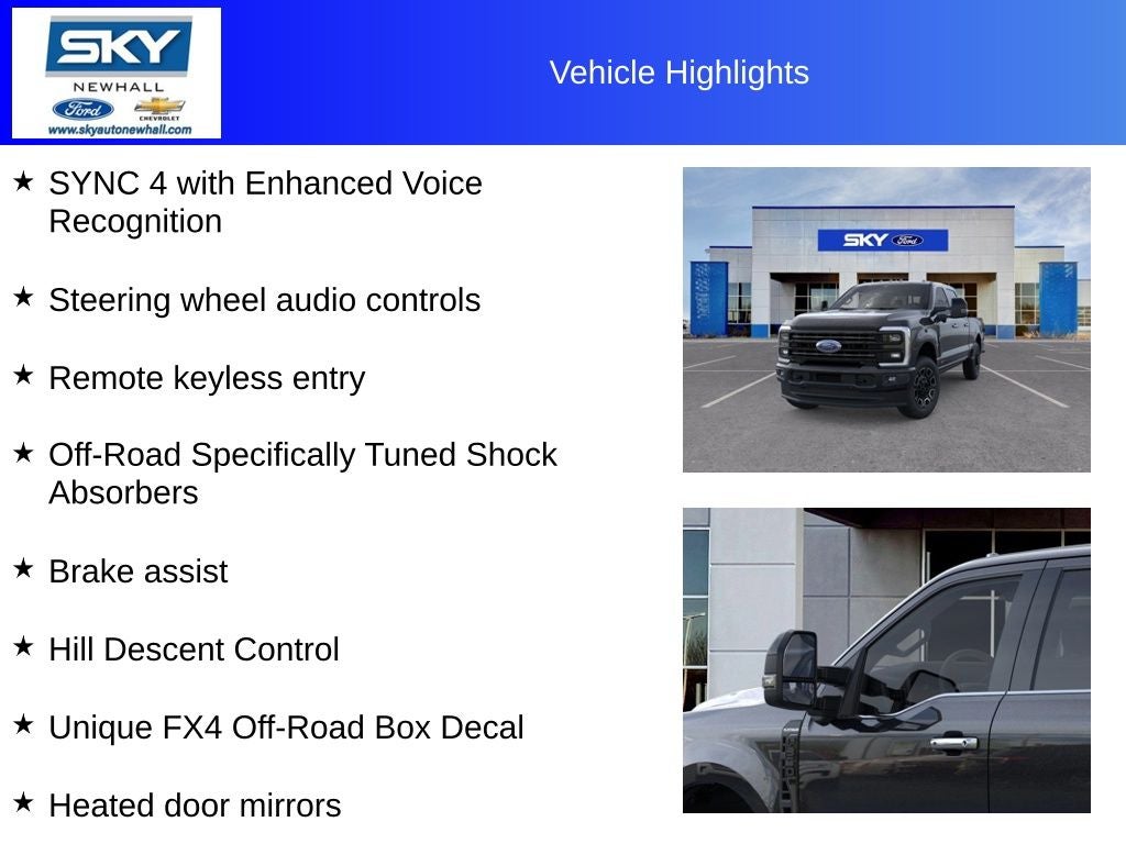 4WD, Brake assist, Electronic-Locking with 3.73 Axle Ratio, Flow-Through Console, Ford Connectivity Package (1-Year Included), FX4 Off-Road Package, GVWR: 12,000 Lb Payload Package, Heated door mirrors, Hill Descent Control, Internet access capable: 5G Modem - Ford Connectivity Package, Off-Road Specifically Tuned Shock Absorbers, Order Code 713A, Radio: B&O Unleashed Sound System by Bang & Olufsen, Remote keyless entry, SiriusXM with 360L, Snow Plow Prep Package, Split folding rear seat, Steering wheel audio controls, SYNC 4 with Enhanced Voice Recognition, Unique FX4 Off-Road Box Decal, Unique Platinum Leather 40/Console/40 Seats, Wheels: 20 Bright Machined and Painted Aluminum.