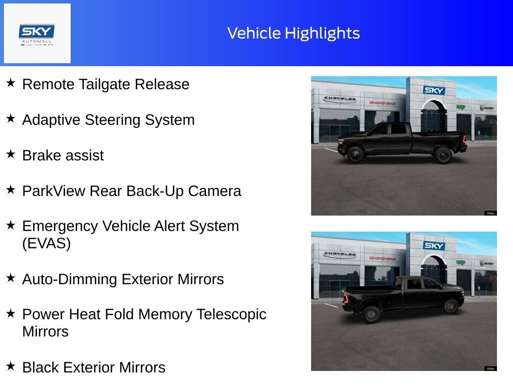 Diamond Black Crystal Pearlcoat 2026 Ram 3500 Laramie 4WD 8-Speed Automatic 6.7L I6 #1 Seat Foam Cushion, 115V Auxiliary Rear Power Outlet, 14.4 Touchscreen Display, 17 Speaker Harman/Kardon Premium Sound, 2 Way Rear Headrest Seat, 2nd Row in Floor Storage Bins, 4 Way Front Headrests, 4G LTE Wi-Fi Hot Spot, 5th Wheel/Gooseneck Towing Prep Group, Active Lane Management System, Adaptive Steering System, Alexa Built-in, Alloy wheels, Apple CarPlay, Apple CarPlay/Android Auto, Auto Adjust in Reverse Exterior Mirrors, Auto Dimming Exterior Passenger Mirror, Auto High Beam Headlamp Control, Auto Power-Folding Mirrors, Auto-Dimming Exterior Mirrors, Black Exterior Mirrors, Black Exterior Truck Badging, Black Wheel Center Hub, Body Color Grille Surround, Brake assist, Bucket Seats, Center Stop Lamp with Cargo View Camera, Chrome Exterior Mirrors, Connected Travel and Traffic Services, Connectivity - US/Canada, Disassociated Touchscreen Display, Drowsy Driver Detection, Dual Wireless Charging Pad, Emergency Vehicle Alert System (EVAS), Exterior Mirrors Courtesy Lamps, Exterior Mirrors with Heating Element, Exterior Mirrors with Memory, Exterior Mirrors with Supplemental Signals, Foam Bottle Insert (door Trim Panel), Folding Flat Load Floor Storage, For Details Visit DriveUconnect.com, For More Info, Call 800-643-2112, Forward and Reverse Utility Lights, Front Seat Back Map Pockets, Full Length Upgraded Floor Console, Global Telematics Box Module, Gloss Black Grille Billets/Accents, Google Android Auto, GPS Antenna Input, GPS Navigation, HD Radio, Heated door mirrors, Heated Front Seats, Heated Steering Wheel, High Back Seats, Integrated Voice Command with Bluetooth®, Laramie Level 2 Plus Equipment Group, Leather Trimmed Bucket Seats, LED Bed Lighting, Mirror Running Lights, MOPAR Deployable Bed Step, MOPAR Spray in Bedliner, Night Edition, Off-Road Information Pages, ParkView Rear Back-Up Camera, Power 2-Way Driver Lumbar Adjust, Power 2-Way Passenger Lumbar Adjust, Power Adjust 8-Way Driver Seat, Power Adjust 8-Way Front Passenger Seat, Power Adjust Mirrors, Power Adjustable Pedals with Memory, Power Deployable Running Boards, Power Heat Fold Memory Telescopic Mirrors, Power Telescoping Mirrors, Power-Adjustable Convex Aux Mirrors, Quick Order Package 24H Laramie, Radio: Uconnect 5 Price includes: $1000 - 2026 National Bonus Cash . Exp. 03/02/2026 Discount available on eligible purchases when you finance through a participating preferred lender and trade in a 2016 or newer vehicle with fewer than 75,000 miles. Customers using outside financing or manufacturer special APR programs (including 0%) are not eligible. All financing subject to credit approval and program availability. Offer valid through Exp. 01/31/2030. See dealer for details Discount available on eligible purchases when you finance through a participating preferred lender AND trade in a 2016 or newer vehicle with fewer than 75,000 miles. Customers using outside financing or manufacturer special APR programs (including 0%) are not eligible. All financing subject to credit approval and program availability. Offer valid through Exp. 01/30/2031. See