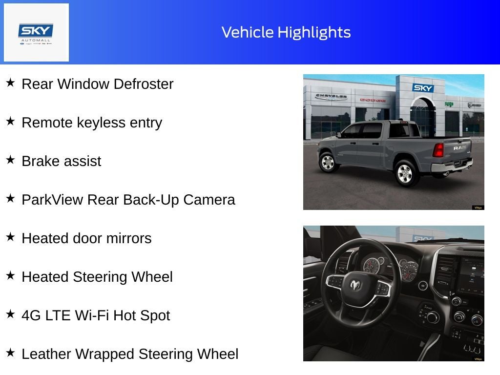 Billet Silver Metallic Clearcoat 2026 Ram 1500 Big Horn/Lone Star 4WD 8-Speed Automatic HEMI 5.7L V8 Multi Displacement VVT eTorque 4G LTE Wi-Fi Hot Spot, Alloy wheels, Apple CarPlay/Android Auto, Brake assist, Heated door mirrors, Heated Front Seats, Heated Steering Wheel, Leather Wrapped Steering Wheel, ParkView Rear Back-Up Camera, Rear Window Defroster, Remote keyless entry. Price includes: $3500 - 2026 National Retail Consumer Cash . Exp. 02/02/2026 Discount available on eligible purchases when you finance through a participating preferred lender and trade in a 2016 or newer vehicle with fewer than 75,000 miles. Customers using outside financing or manufacturer special APR programs (including 0%) are not eligible. All financing subject to credit approval and program availability. Offer valid through Exp. 01/31/2030. See dealer for details Discount available on eligible purchases when you finance through a participating preferred lender AND trade in a 2016 or newer vehicle with fewer than 75,000 miles. Customers using outside financing or manufacturer special APR programs (including 0%) are not eligible. All financing subject to credit approval and program availability. Offer valid through Exp. 01/30/2031. See dealer for details