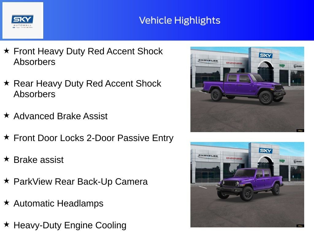Reign 2026 Jeep Gladiator Willys 4WD 8-Speed Automatic 3.6L V6 24V VVT 2-Piece Body Color Fender Flares, 4-Wheel Drive Decal, 4G LTE Wi-Fi Hot Spot, Advanced Brake Assist, Air Conditioning with Auto Temp Control, Apple CarPlay/Android Auto, Automatic Headlamps, Auxiliary Switches, Black Grille with Gloss Black Rings, Brake assist, Class IV Receiver Hitch, Cluster 7.0 TFT Color Display, Corning Gorilla Glass, Daytime Running Lamps LED Accents, Deep Tint Sunscreen Windows, E-Locker Rear Axle, Front Door Locks 2-Door Passive Entry, Front Heavy Duty Red Accent Shock Absorbers, Front LED Fog Lamps, Full Speed Forward Collision Warning Plus, Heavy-Duty Engine Cooling, LED Premium Reflector Headlamps, LED Taillamps, Mold in Color Bumper with Gloss Black, MOPAR All-Weather Slush Mats, Off-Road Plus Mode, ParkView Rear Back-Up Camera, Power Heated Mirrors, Premium Wrapped Steering Wheel, Protection Sill Rails, Quick Order Package 24W Willys, Rear Heavy Duty Red Accent Shock Absorbers, Rear Window Defroster, Remote keyless entry, Security Alarm, Split folding rear seat, Steering wheel mounted audio controls, Sun Visors with Illuminated Vanity Mirrors, Trailer Hitch Zoom, Wheels: 17 x 7.5 Painted Black, Willys Hood Decal, Willys Suspension. Price includes: $1500 - 2026 National Stellantis Loyalty Retail Bonus Cash . Exp. 02/02/2026