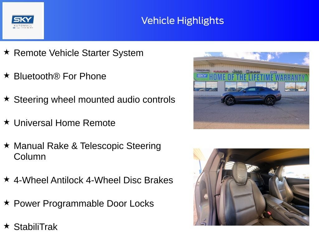 6.2L V8 SFI, 2 Front Cup Holders, 3-Spoke Leather-Wrapped Steering Wheel, 4-Wheel Antilock 4-Wheel Disc Brakes, Alloy wheels, Analog Instrumentation, Audio System Feature USB Port, Bluetooth® For Phone, Boston Acoustics Premium 9-Speaker Audio System, Brake assist, Cargo Convenience Net, Carpeted Front Floor Mats, Electric Rear-Window Defogger, Electronic Cruise Control, Gauges, Heated door mirrors, Heated Driver & Front Passenger Seats, Inside Rearview Autodimming Mirror, LATCH System, Leather Shift Knob, Leather-Appointed Seat Trim, Leather-Wrapped Shift Knob, Maintenance-Free Battery, Manual Rake & Telescopic Steering Column, OnStar 1-Year Directions & Connections Plan, Power Programmable Door Locks, Preferred Equipment Group 2SS, Rear Parking Sensors, Rear window defroster, Remote Keyless Entry, Remote Vehicle Starter System, Spoiler, StabiliTrak, Stainless-Steel Dual-Outlet Exhaust, Steering Wheel Mounted Audio Controls, Steering wheel mounted audio controls, Universal Home Remote, Wireless PDIM, XM Radio. Cyber Gray Metallic 2010 Chevrolet Camaro SS 2SS RWD 6-Speed Automatic with TapShift 6.2L V8 SFI