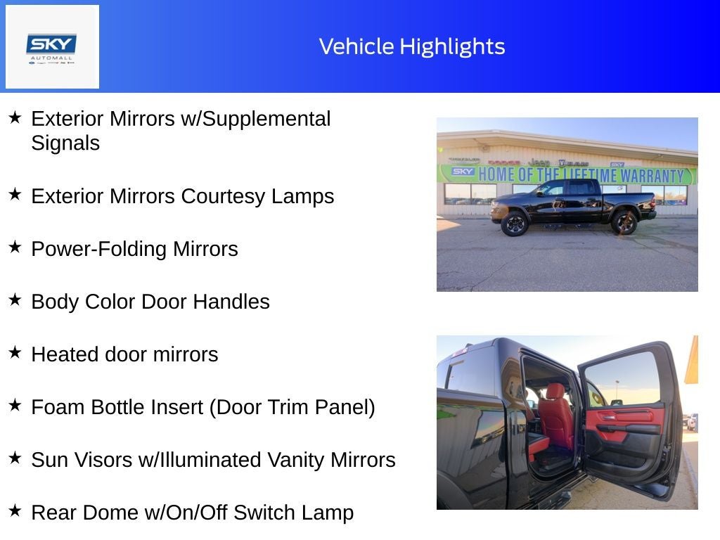 115V Auxiliary Rear Power Outlet, 4G LTE Wi-Fi Hot Spot, Air Conditioning ATC w/Dual Zone Control, Alloy wheels, Apple CarPlay, Auto-Dimming Exterior Driver Mirror, Black Premium Power Mirrors, Body Color Door Handles, Brake assist, Exterior Mirrors Courtesy Lamps, Exterior Mirrors w/Supplemental Signals, Foam Bottle Insert (Door Trim Panel), Heated door mirrors, Heated Front Seats, Heated Steering Wheel, Leather steering wheel, Media Hub w/2 Charge Only USBs, ParkSense Front/Rear Park Assist w/Stop, ParkView Rear Back-Up Camera, Power Adjustable Pedals, Power-Folding Mirrors, Quick Order Package 25W Rebel, Radio: Uconnect 4 w/8.4 Display, Rain Sensitive Windshield Wipers, Rear Dome w/On/Off Switch Lamp, Rear Underseat Compartment Storage, Rear Window Defroster, Rebel Level 2 Equipment Group, Remote keyless entry, Remote Proximity Keyless Entry, Remote Start System, Security Alarm, Split folding rear seat, Steering wheel mounted audio controls, Sun Visors w/Illuminated Vanity Mirrors, Universal Garage Door Opener. Diamond Black Crystal Pearlcoat 2021 Ram 1500 Rebel 4WD 8-Speed Automatic HEMI 5.7L V8 Multi Displacement VVT