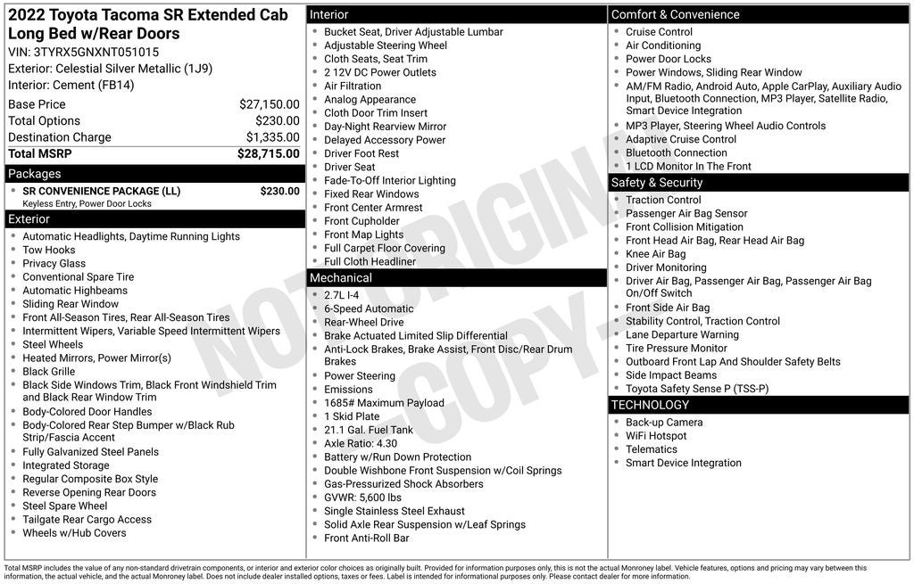 Behind the wheel, the Tacoma SR5 delivers a smooth and responsive driving experience, making it just as enjoyable on long highway drives as it is on back roads or job sites. Toyota’s reputation for reliability shines through, giving you peace of mind whether you’re commuting, hauling gear, or heading out on your next adventure. With its versatile nature and proven durability, the 2022 Tacoma SR5 is a truck you can count on for years to come.