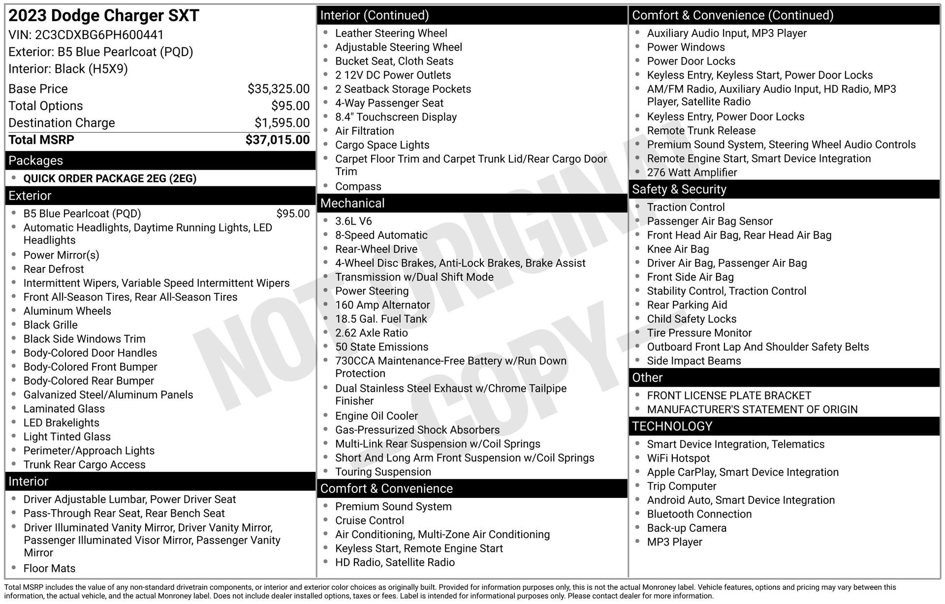 Black Cloth, 4G LTE Wi-Fi Hot Spot, Alloy wheels, Apple CarPlay/Android Auto, Brake assist, Leather Shift Knob, ParkView Rear Back-Up Camera, Quick Order Package 2EG, Rear window defroster, Remote keyless entry, Split folding rear seat, Steering wheel mounted audio controls. B5 Blue Pearlcoat 2023 Dodge Charger SXT RWD 8-Speed Automatic 3.6L V6 24V VVT