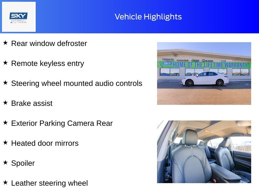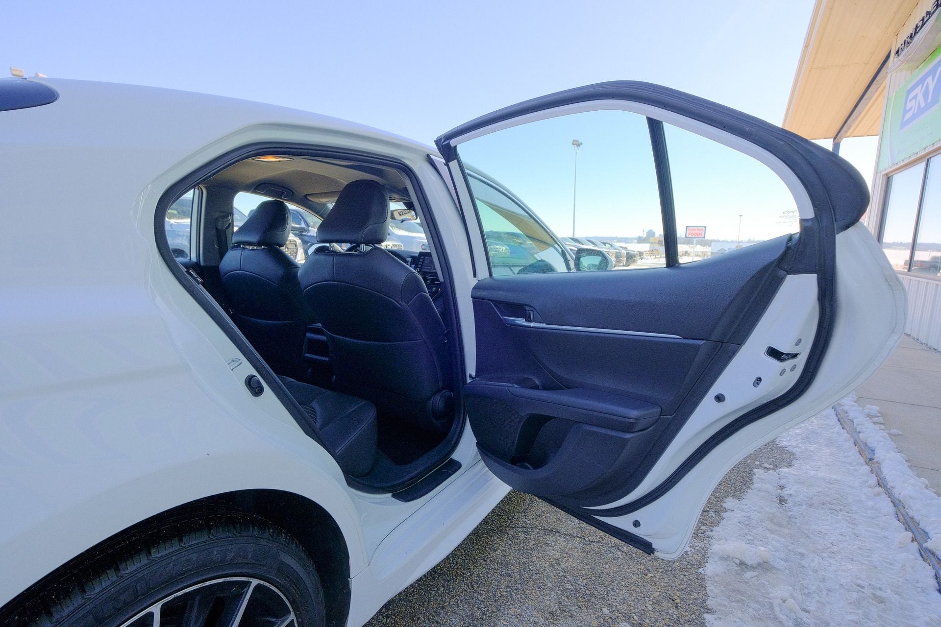 Alloy wheels, Apple CarPlay/Android Auto, Brake assist, Exterior Parking Camera Rear, Heated door mirrors, Leather steering wheel, Rear window defroster, Remote keyless entry, Split folding rear seat, Spoiler, Steering wheel mounted audio controls. White 2023 Toyota Camry SE FWD 8-Speed Automatic 2.5L I4 DOHC 16V