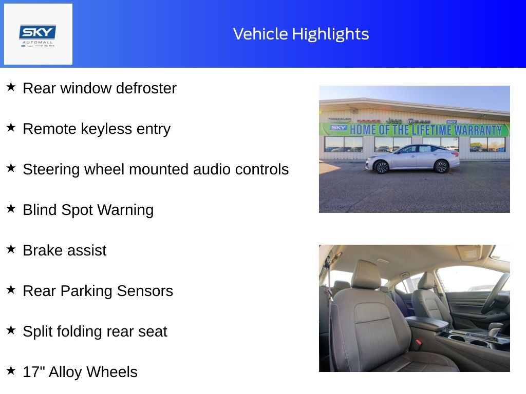 CVT with Xtronic, 17 Alloy Wheels, Alloy wheels, Blind Spot Warning, Brake assist, Rear Parking Sensors, Rear window defroster, Remote keyless entry, Split folding rear seat, Steering wheel mounted audio controls. Brilliant Silver Metallic 2024 Nissan Altima 2.5 SV FWD CVT with Xtronic 2.5L 4-Cylinder DOHC 16V