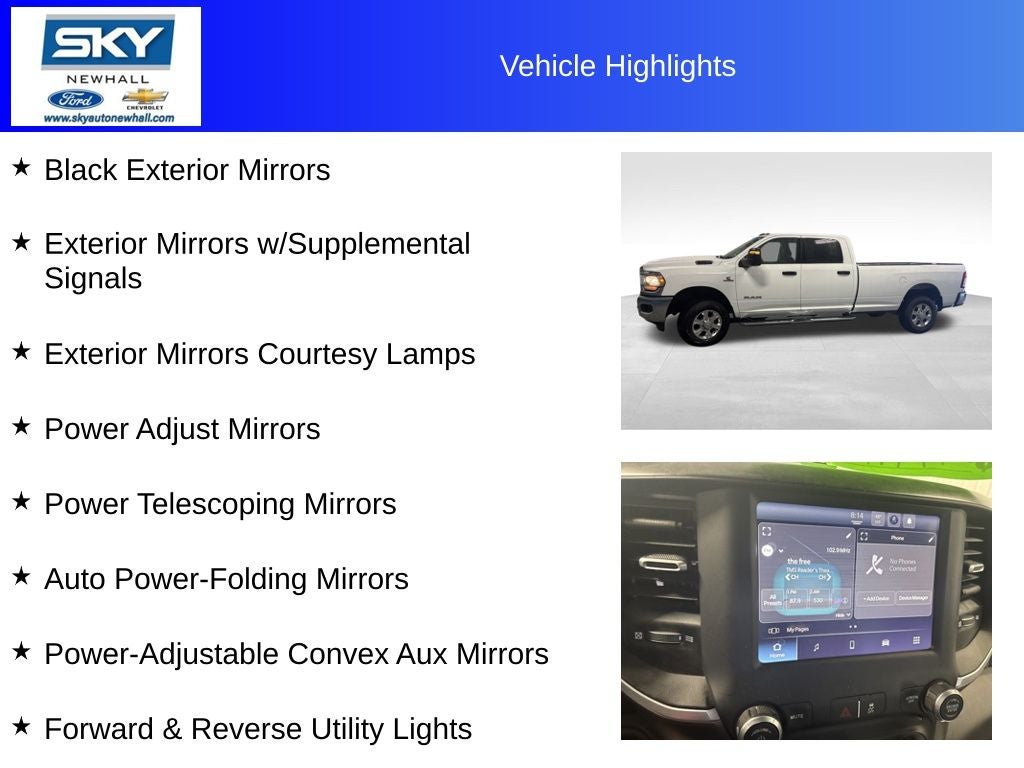 2nd Row In Floor Storage Bins, 4G LTE Wi-Fi Hot Spot, Auto Power-Folding Mirrors, Black Exterior Mirrors, Brake assist, Center Hub, Dual Glove Boxes, Exterior Mirrors Courtesy Lamps, Exterior Mirrors w/Heating Element, Exterior Mirrors w/Supplemental Signals, Foam Bottle Insert (Door Trim Panel), Footwell Courtesy Lamp, Forward & Reverse Utility Lights, Front Fog Lamps, Glove Box Lamp, Heated door mirrors, Leather Wrapped Steering Wheel, Level 1 Equipment Group, Locking Lower Glove Box, Mirror Running Lights, ParkView Rear Back-Up Camera, Power Adjust Mirrors, Power Heated Fold Telescopic Mirrors, Power Telescoping Mirrors, Power-Adjustable Convex Aux Mirrors, Premium Cloth 40/20/40 Bench Seat, Quick Order Package 2HZ Big Horn, Radio: Uconnect 5 w/8.4 Display, Rear Dome w/On/Off Switch Lamp, Remote keyless entry, Steering Wheel Mounted Audio Controls, Wheels: 18 x 8.0 Polished Aluminum.