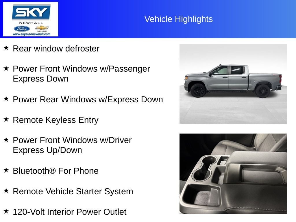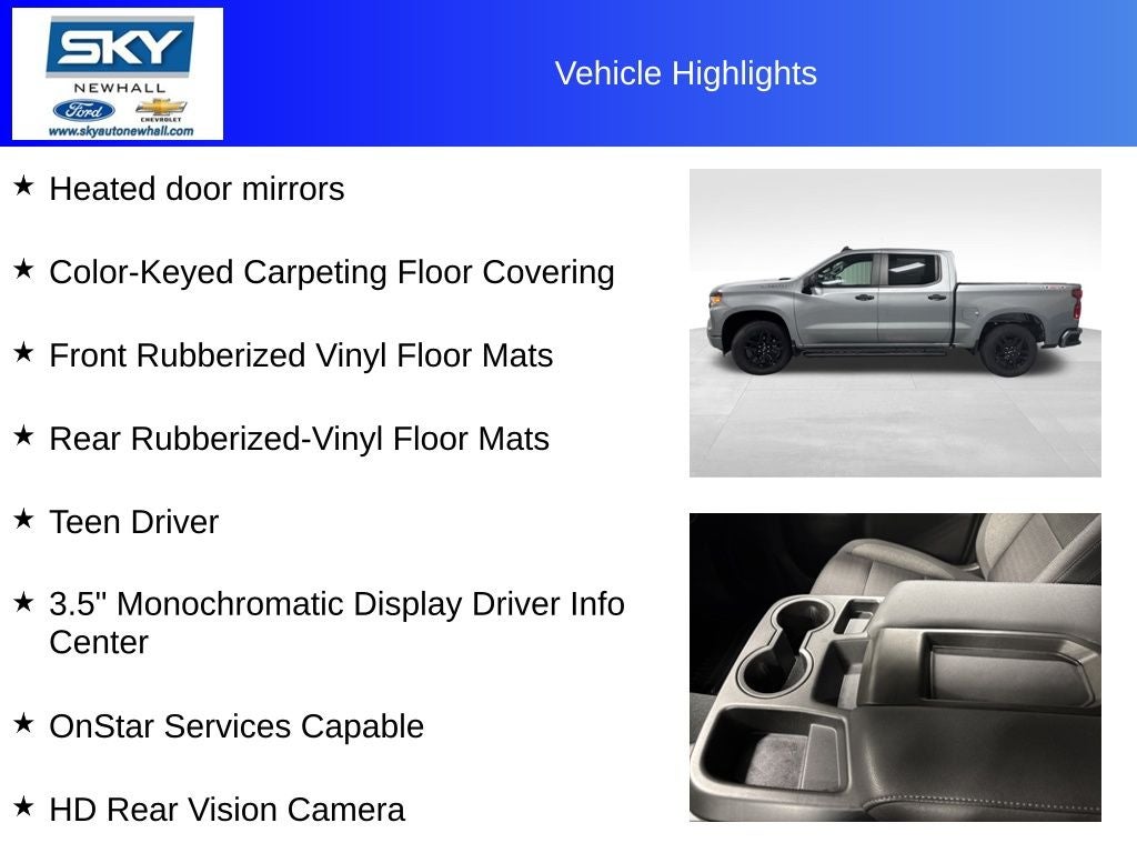 8-Speed Automatic, 4WD, Black Cloth, 10-Way Power Driver Seat w/Lumbar, 120-Volt Interior Power Outlet, 3.5 Monochromatic Display Driver Info Center, Apple CarPlay/Android Auto, Black Alloy Wheels, Bluetooth® For Phone, Brake assist, Color-Keyed Carpeting Floor Covering, Custom Convenience Package, Custom Value Package, Deep-Tinted Glass, Dual Rear USB Ports (Charge Only), Electric Rear-Window Defogger, Electronic Cruise Control, EZ Lift Power Lock & Release Tailgate, Front Frame-Mounted Black Recovery Hooks, Front Rubberized Vinyl Floor Mats, HD Rear Vision Camera, Heated door mirrors, High Capacity Suspension Package, LED Cargo Area Lighting, Manual Tilt Wheel Steering Column, OnStar Services Capable, Power Front Windows w/Driver Express Up/Down, Power Front Windows w/Passenger Express Down, Power Rear Windows w/Express Down, Preferred Equipment Group 1CX, Rear 60/40 Folding Bench Seat (Folds Up), Rear Rubberized-Vinyl Floor Mats, Rear window defroster, Remote Keyless Entry, Remote Vehicle Starter System, SiriusXM Trial Subscription, Split folding rear seat, Standard Tailgate, Teen Driver, Theft Deterrent System (Unauthorized Entry), Tire Pressure Monitoring System, Trailering Package.