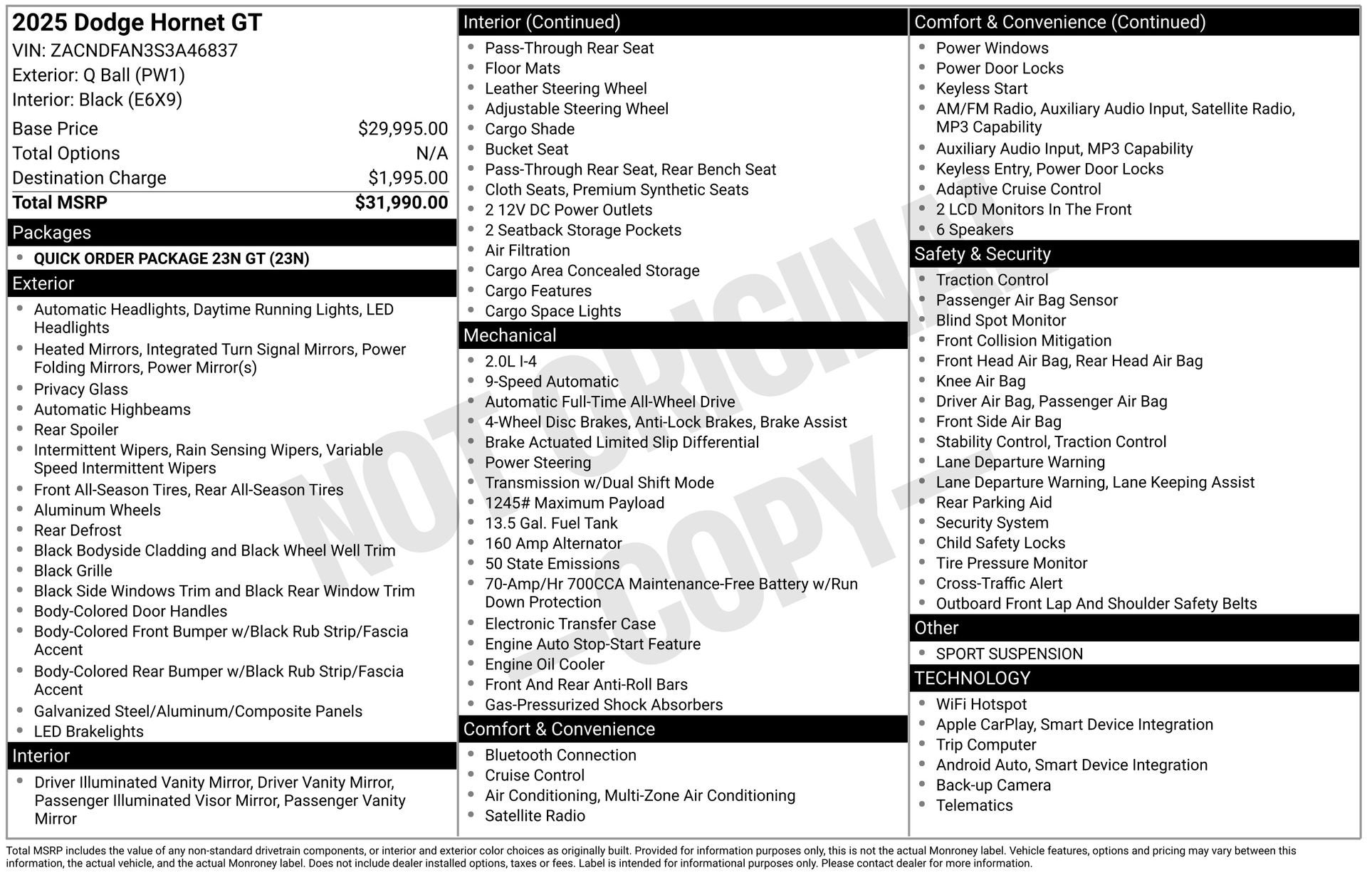 Q Ball 2025 Dodge Hornet GT AWD 9-Speed 948TE Automatic 2.0L I4 DOHC Alloy wheels, Apple CarPlay/Android Auto, Brake assist, Heated door mirrors, Leather steering wheel, ParkView Rear Back-Up Camera, Quick Order Package 23N GT, Rear window defroster, Remote keyless entry, Split folding rear seat, Spoiler.